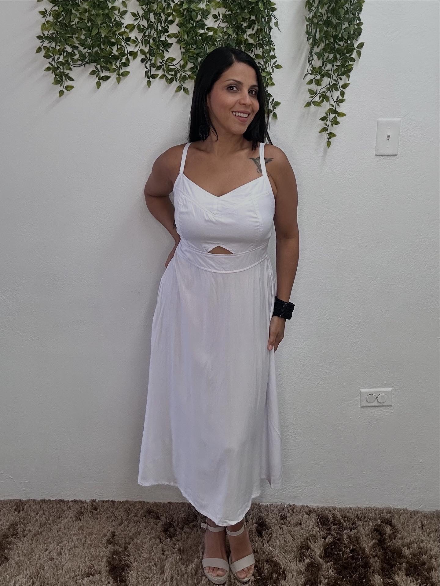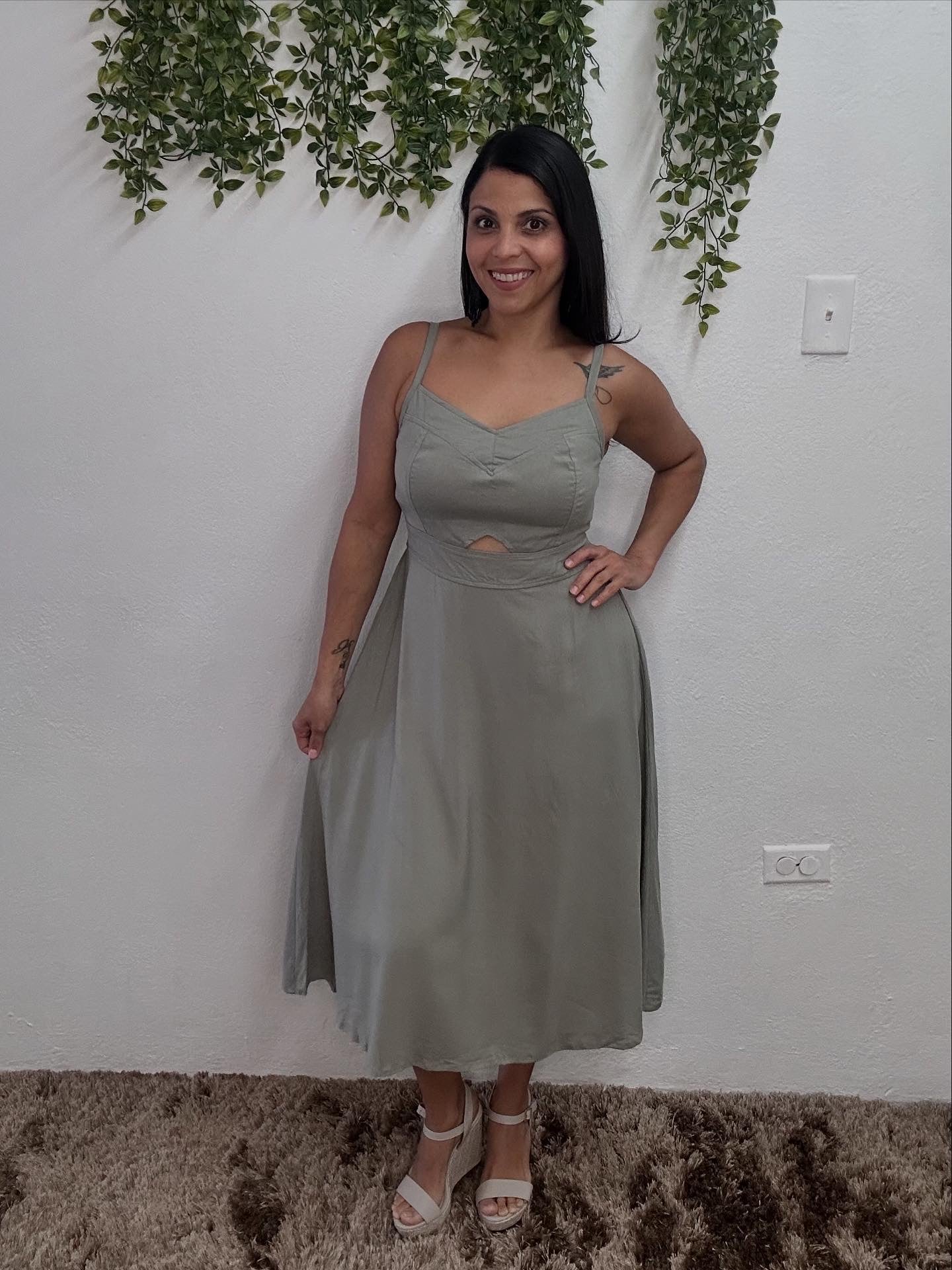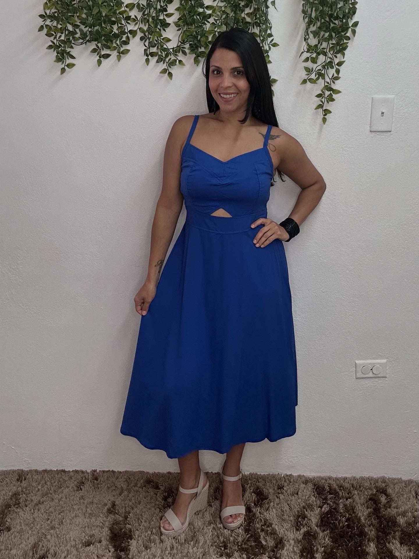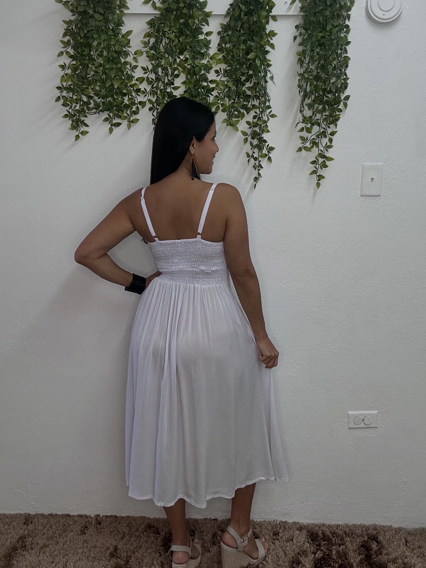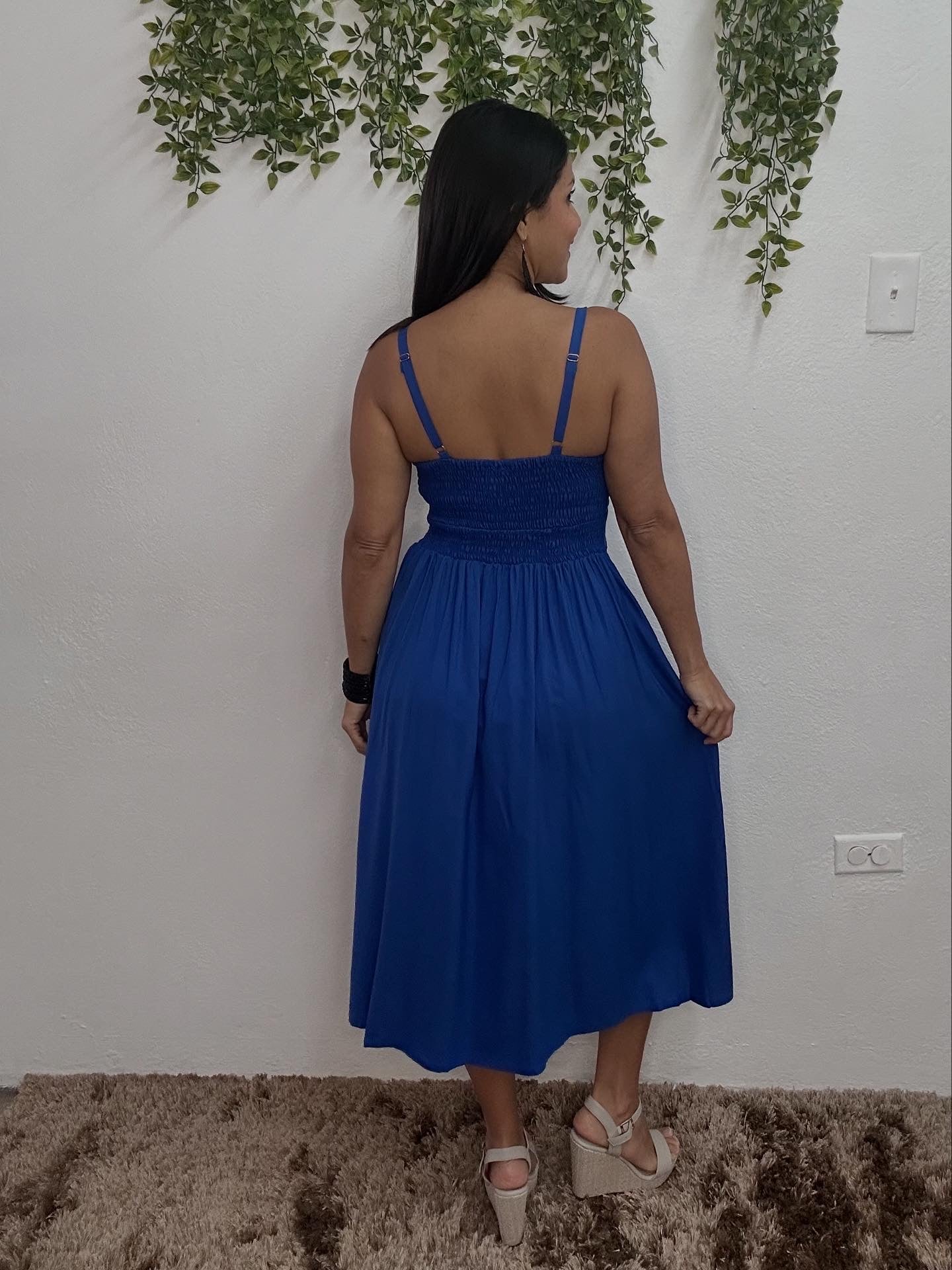 3/4 length dress with elastic at the back.