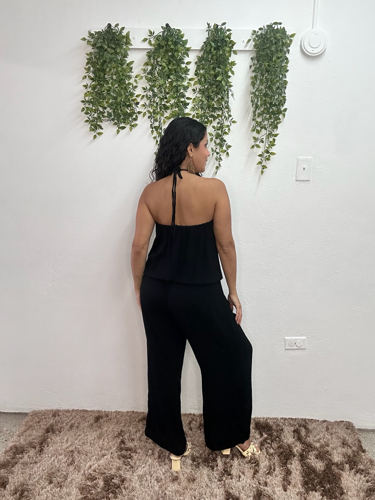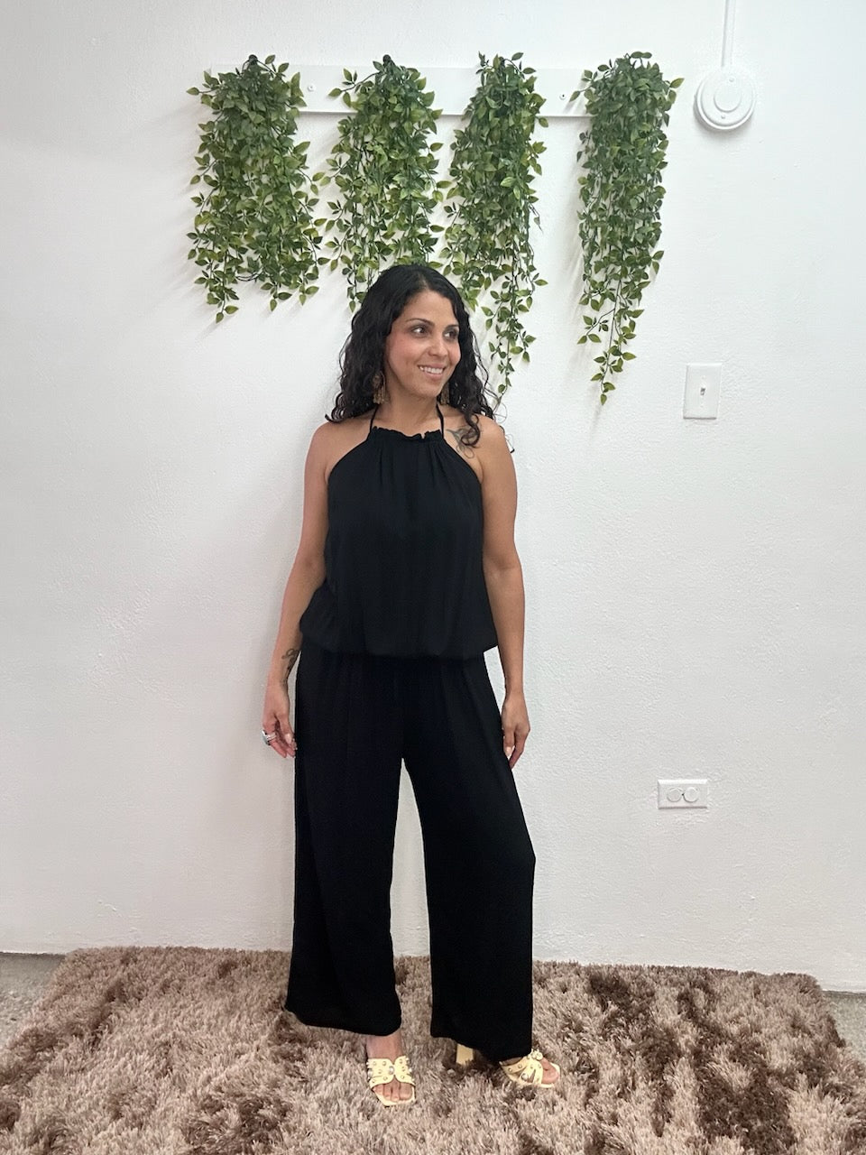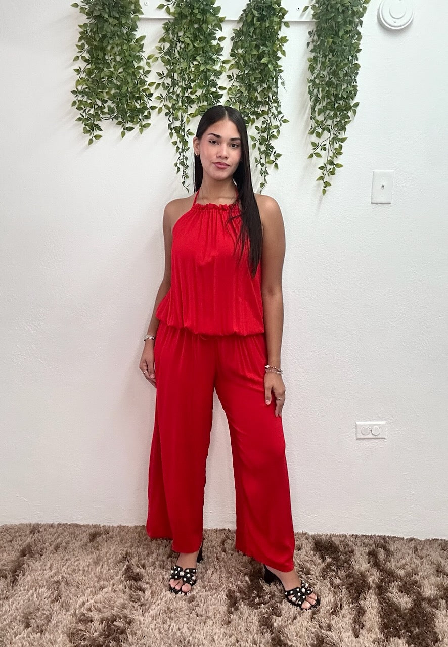 Luce fresca, cómoda y espectacular con este jumpsuit de caída suelta y diseño halter fruncido que favorece todas las figuras. Ideal para cualquier ocasión donde quieras brillar.