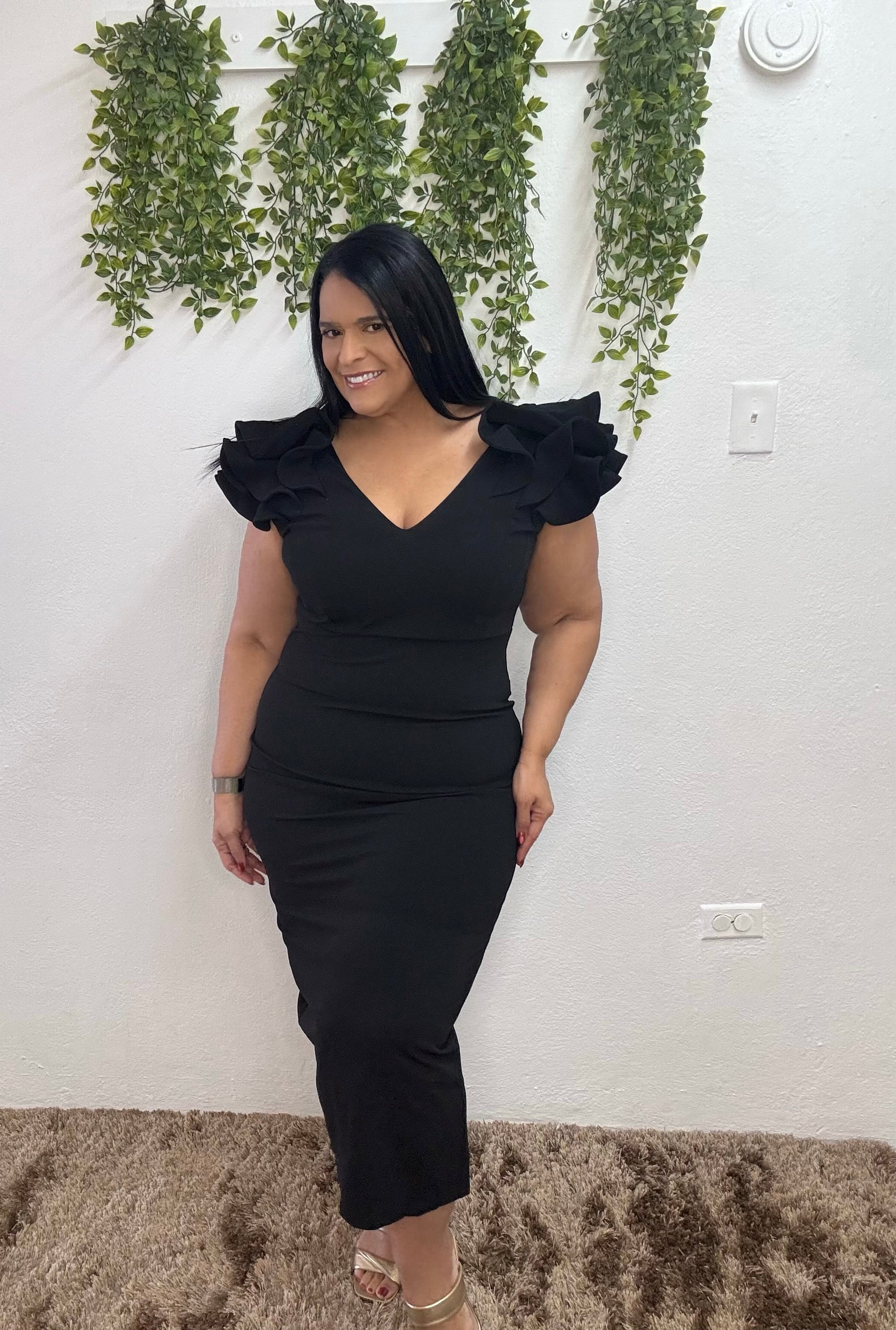 Very comfortable and elegant 3/4 length dress. Features a detail on the sleeves. Super stretchy fabric. Zipper closure at the back.