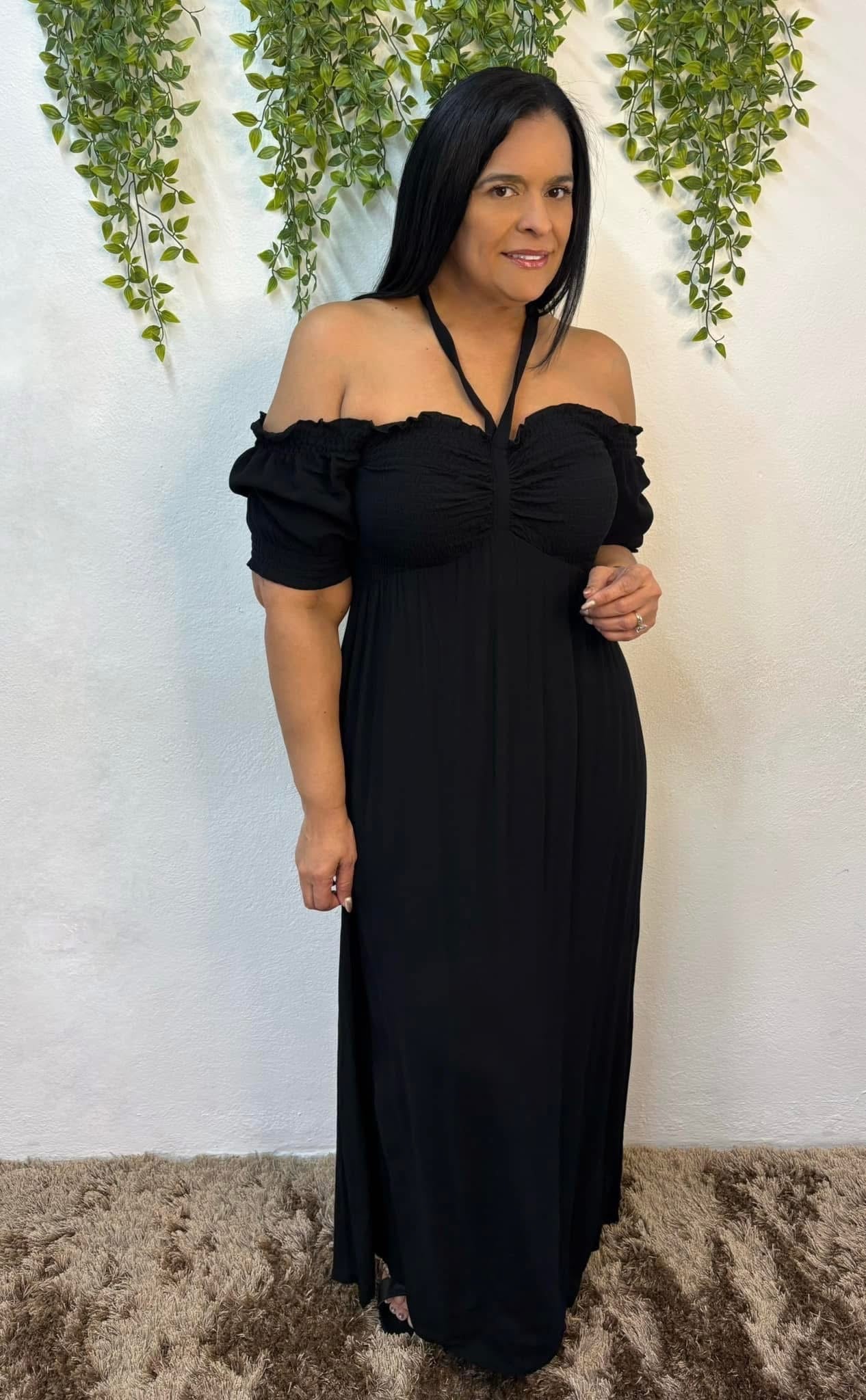 El Ayana Dress es un vestido largo con un diseño delicado y femenino. Se amarra al cuello, creando un escote elegante, y cuenta con mangas en la parte superior del busto que añaden un toque moderno y romántico.